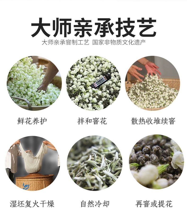 七窨烘装(95道工艺) 银毫级以上特种茶 原料:高山雨前单芽绿茶,福州茉莉鲜花